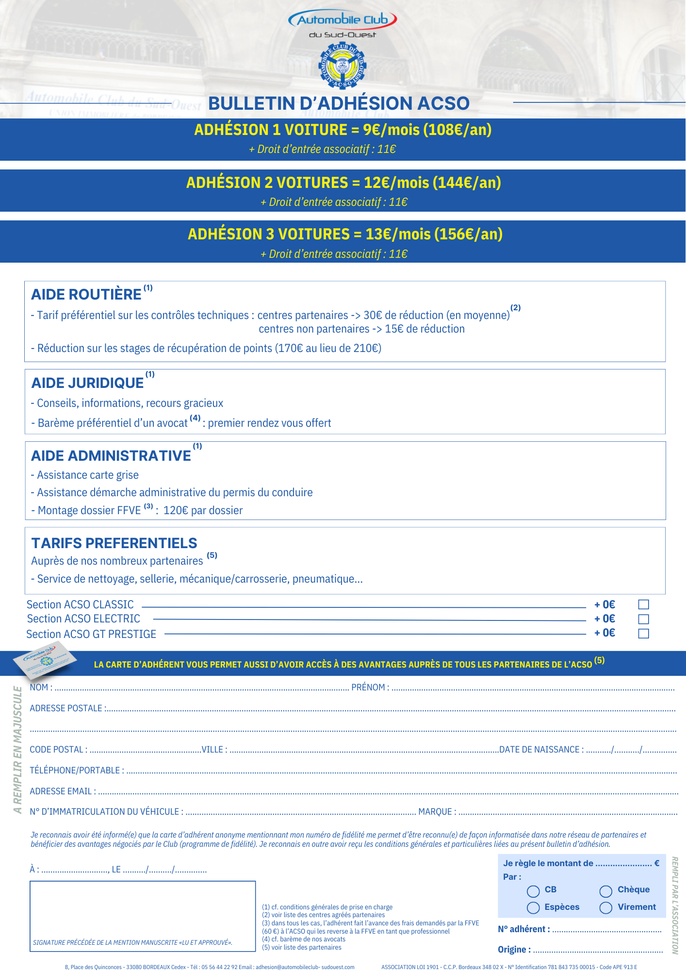 Adhésion annuelle : 9€/mois ou 108€/an + 11€ de droit d’entrée